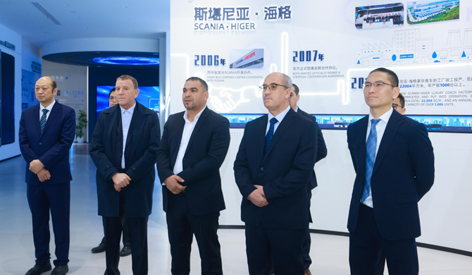 蘇州金龍副總經(jīng)理鄭春輝(右一)、海外銷售總經(jīng)理姜海峰(左一)陪同阿方代表參觀展廳